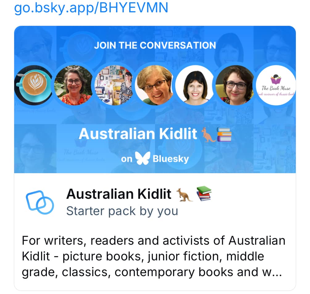 I’m joining the mass exodus of Twitter/X and have signed up to Bluesky. Highly recommend. It’s much friendlier than the other one & personally I find it more intuitive than Threads. I’ve created a Starter Pack for Australian Kidlit writers & readers. Simply paste the link and instantly follow like-minded Aussie Kidlit tragics and activists. Let me know if you’d like to be added. https://go.bsky.app/BHYEVMN